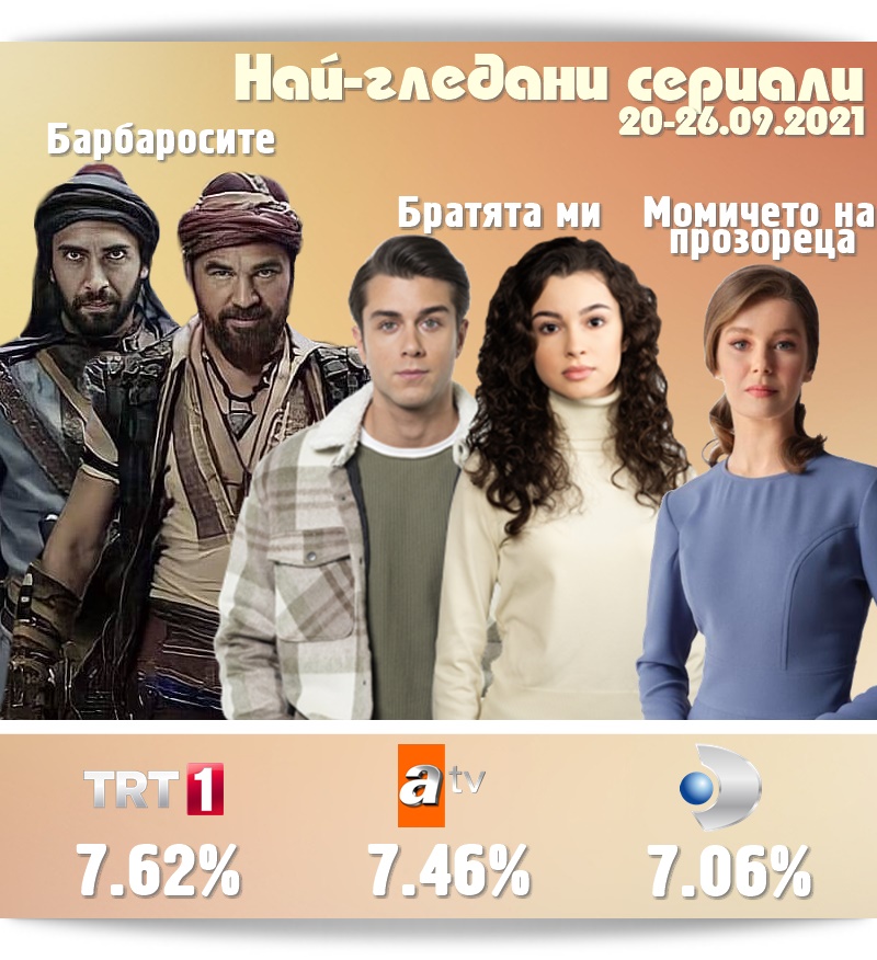 "Барбаросите" (Barbaroslar) е най-гледаният сериал в Турция за втора поредна седмица. Новата историческа драма на TRT1 с Енгин Алтан Дюзятан и Улаш Туна Астепе оглавява рейтинг-класацията с много висок рейтинг от 8%. Сред новостартиралите през изминалия месец септември проекти с доста добро представяне е и "Съд" (Yargı) на KanalD, който с втория си епизод повиши значително представянето си до пет-шест пункта. Уви, останалите нови сериали се провалят. "Приказка за далечния град" (Uzak Şehrin Masalı) на FOX и "Лъжец" (Yalancı) и "Един от нас" (İçimizden Biri) на ShowTV не привличат очаквания висок интерес и след началата си, което ги прави първите провали този сезон, уви. Новата драма "Всичко за брака" (Evlilik Hakkında Her Şey) на FOX стартира със средно представяне, като от решаващо значение ще бъде рейтингът, който ще отбележи с втората си серия тази седмица.